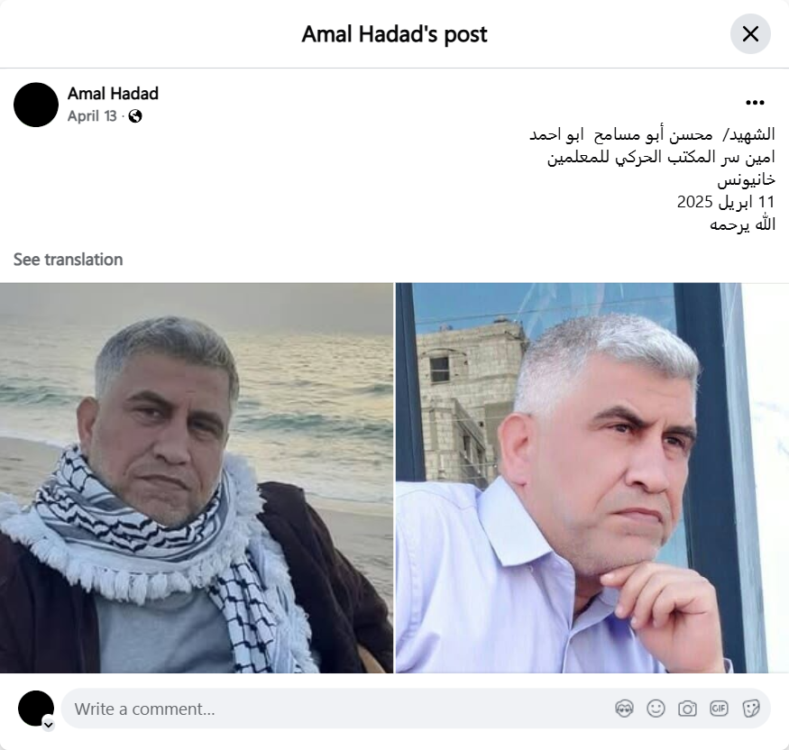Martyr/ Mohsen Abu Musameh Abu Ahmed, Secretary of the Teachers' Movement Office, Khan Yunis, April 11, 2025