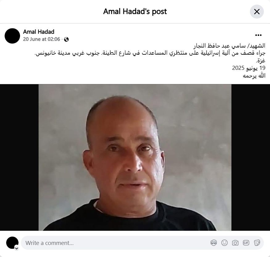 الشهيد/ سامي عبد حافظ النجارجراء قصف من آلية إسرائيلية على منتظري المساعدات في شارع الطينة. جنوب غربي مدينة خانيونس.غزة.19 يونيو 2025الله يرحمه
