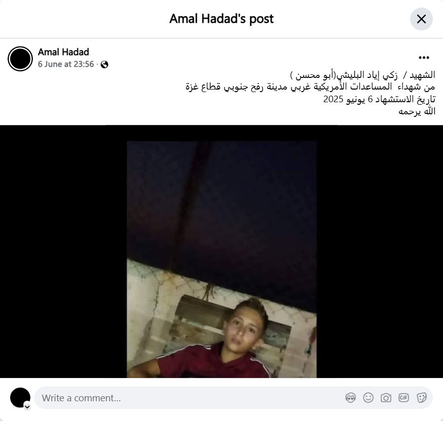 الشهيد / زكي إياد البليشي(أبو محسن )من شهداء المساعدات الأمريكية غربي مدينة رفح جنوبي قطاع غزةتاريخ الاستشهاد 6 يونيو 2025الله يرحمه
