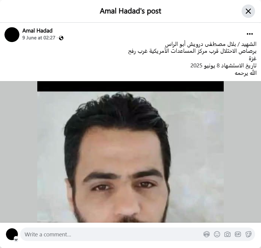 Martyr / Bilal Mustafa Darwish Abu Al-Ras, shot by the occupation forces near the American aid center west of Rafah, Gaza. Date of martyrdom: June 8, 2025. May God have mercy on him.