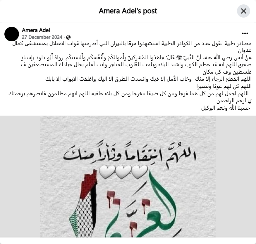 Medical sources say a number of medical personnel were martyred by burning in the fires set by the occupation forces in Kamal Adwan Hospital. On the authority of Anas, may God be pleased with him, that the Prophet, peace and blessings be upon him, said: “Fight the polytheists with your wealth, your lives, and your tongues.” Narrated by Abu Dawud with a sound chain of narration. O God, the distress has become great, the affliction has intensified, and hearts have reached the throats, and You know best the condition of Your oppressed servants in Palestine and everywhere. O God, hope has been cut off except from You, and hope has been disappointed except in You, and the paths have been blocked except to You, and the doors have been closed except for Your door. O God, be their helper and supporter. O God, make for them a way out of every distress, a way out of every hardship, and a cure for every affliction. O God, they are wronged, so support them with Your mercy, O Most Merciful of the merciful. God is sufficient for us, and He is the best Disposer of affairs.