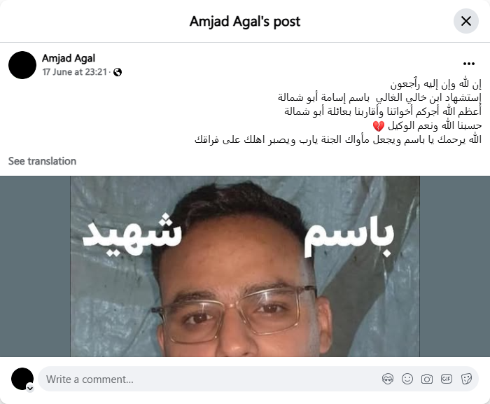 The martyrdom of my dear cousin, Osama Abu Shamala. May God reward you greatly, our sisters and relatives in the Abu Shamala family.