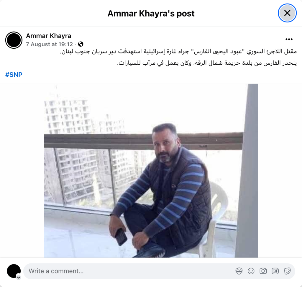 Syrian refugee Aboud al-Yahya al-Fares was killed in an Israeli airstrike targeting Deir Sarian in southern Lebanon.