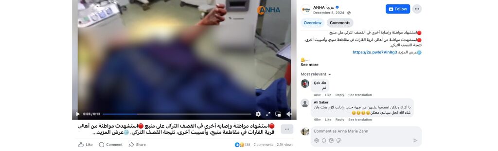 🔴استشهدت مواطنة من أهالي قرية الفارات في مقاطعة منبج، وأًصيبت أخرى، نتيجة القصف التركي.