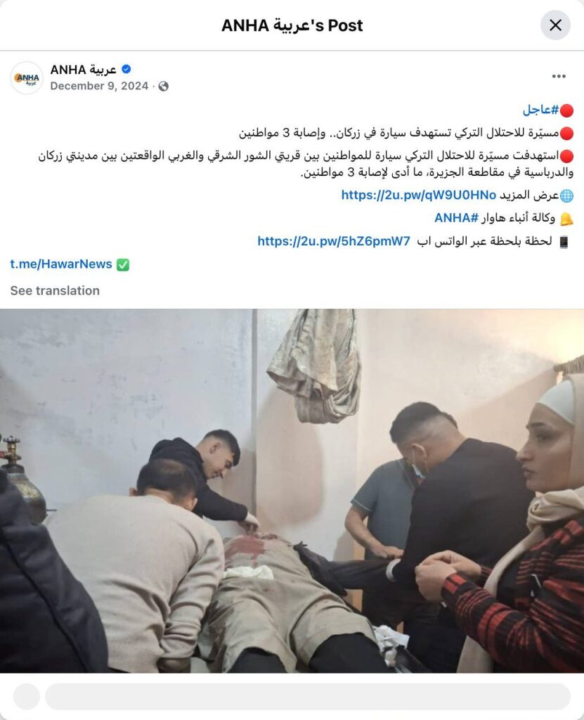 استهدفت مسيّرة للاحتلال التركي سيارة للمواطنين بين قريتي الشور الشرقي والغربي الواقعتين بين مدينتي زركان والدرباسية في مقاطعة الجزيرة، ما أدى لإصابة 3 مواطنين.