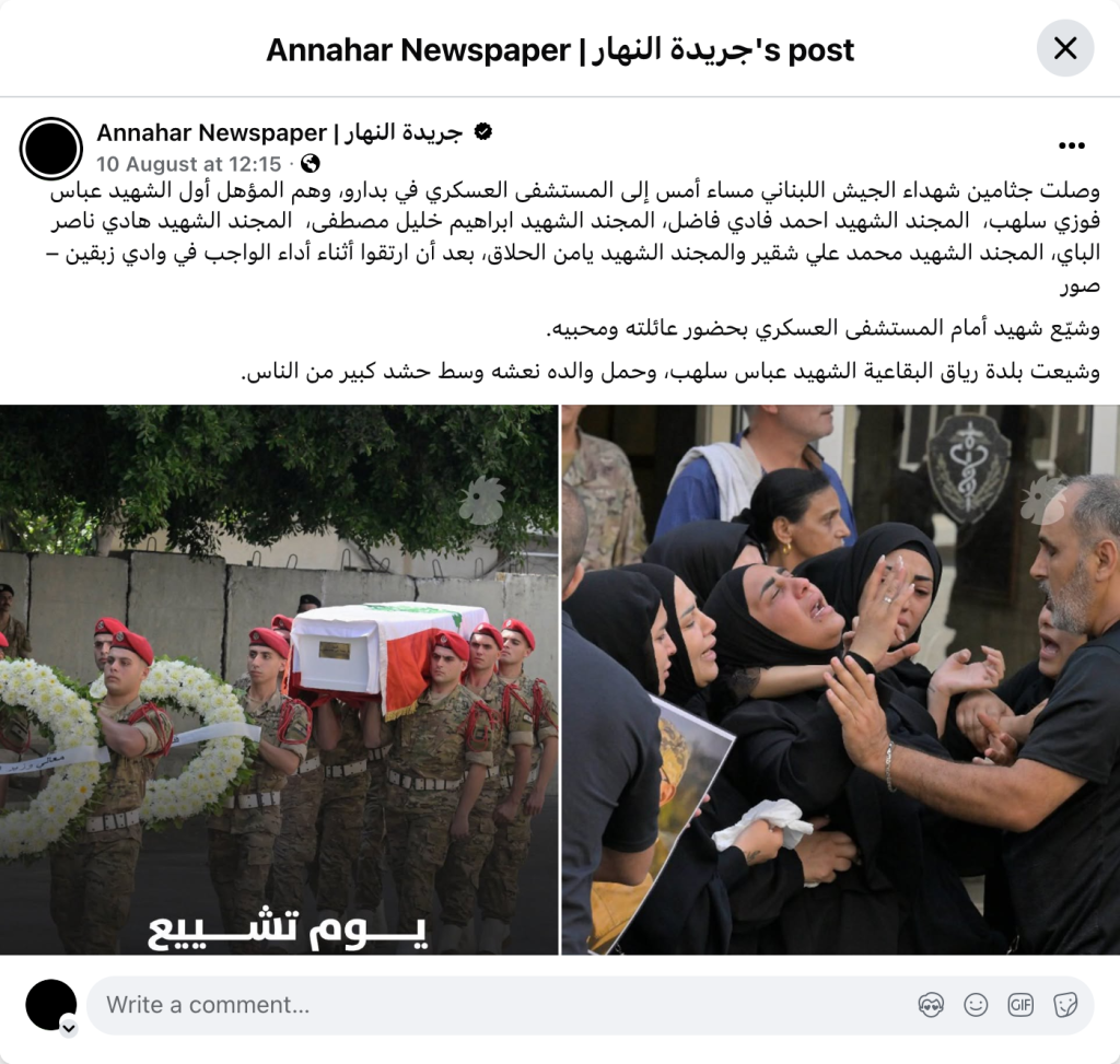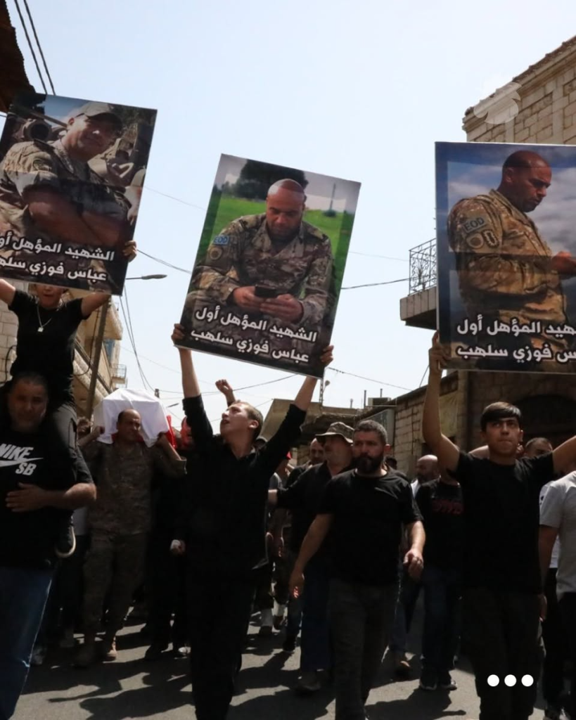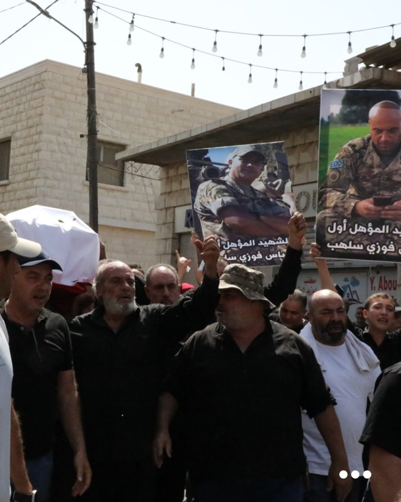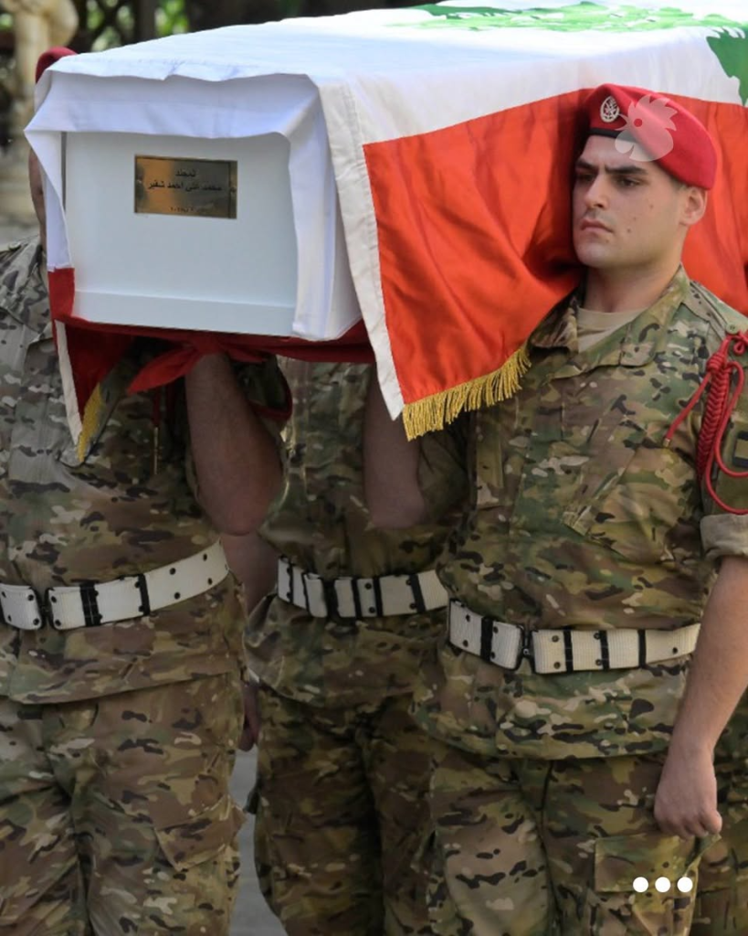 The bodies of the Lebanese Army martyrs arrived yesterday evening at the military hospital in Badaro. They are: First Class Abbas Fawzi Salhab, Martyr Conscript Ahmad Fadi Fadel, Martyr Conscript Ibrahim Khalil Mustafa, Martyr Conscript Hadi Nasser Al-Bay, Martyr Conscript Mohammad Ali Shaqir, and Martyr Conscript Yamen Al-Hallaq. They were martyred while performing their duty in Wadi Zebqin, Tyre. A funeral was held for the martyr in front of the military hospital in the presence of his family and loved ones. The Bekaa town of Rayak held a funeral for Martyr Abbas Salhab, whose father carried his coffin amid a large crowd of people.