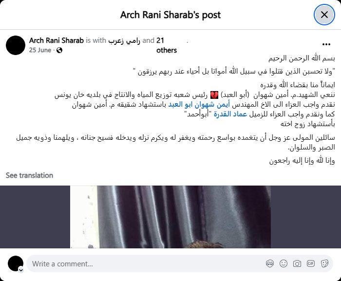 we mourn the martyrdom of Eng. Amin Shahwan (Abu Al-Abd), Head of the Water Distribution and Production Division in the Khan Yunis Municipality.