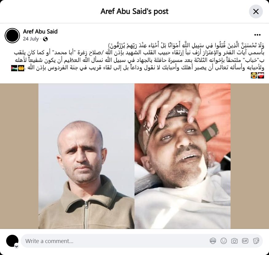 (And never think that those who have been killed in the cause of Allah are dead. Rather, they are alive with their Lord, and they are provided for.) With the greatest verses of pride and honor, I announce the martyrdom of my beloved heart, the martyr, God willing, Salah Zaghra "Abu Muhammad" or as he was called "Khabab", joining his three brothers after a journey filled with jihad in the cause of Allah. We ask God Almighty to be an intercessor for his family and loved ones, and I ask Him, the Almighty, to grant patience to your family and loved ones. We do not say farewell, but until we meet again soon in Paradise, God willing.