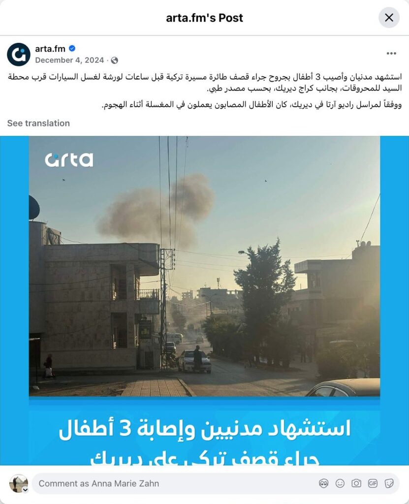 ووفقاً لمراسل راديو آرتا في ديريك، كان الأطفال المصابون يعملون في المغسلة أثناء الهجوم.