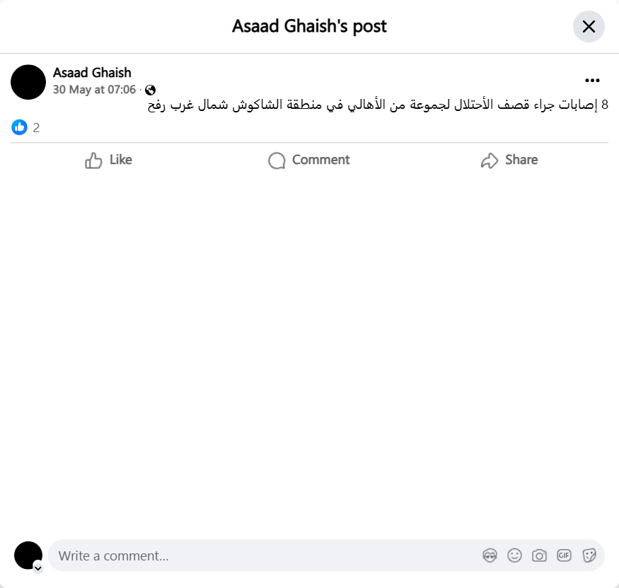 8 injured as a result of the occupation's bombing of a group of residents in the Al-Shakoush area, northwest of Rafah.