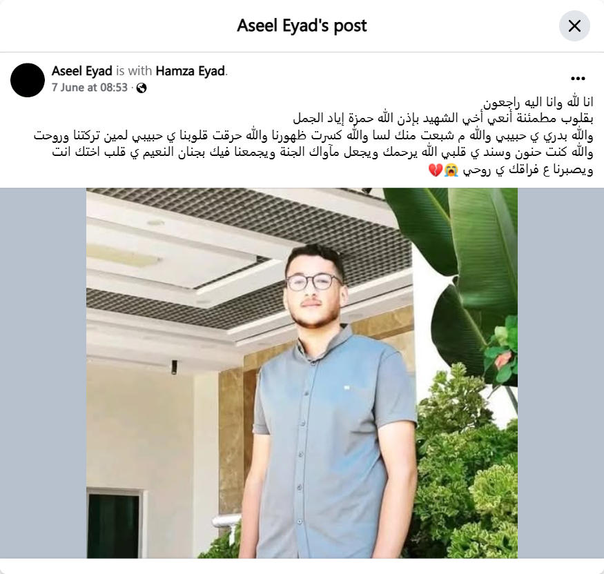 We belong to Allah and to Him we shall return. With reassured hearts, I mourn my brother, the martyr, God willing, Hamza Iyad Al-Jamal. By God, it is too early, my love. By God, I have not had enough of you yet. By God, you broke our backs. By God, you burned our hearts. My love. For whom did you leave us and go? By God, you were affectionate and supportive, my heart. May God have mercy on you and make your abode Paradise and gather us with you in the Gardens of Bliss. My sister’s heart, and may He give us patience for your separation, my soul.