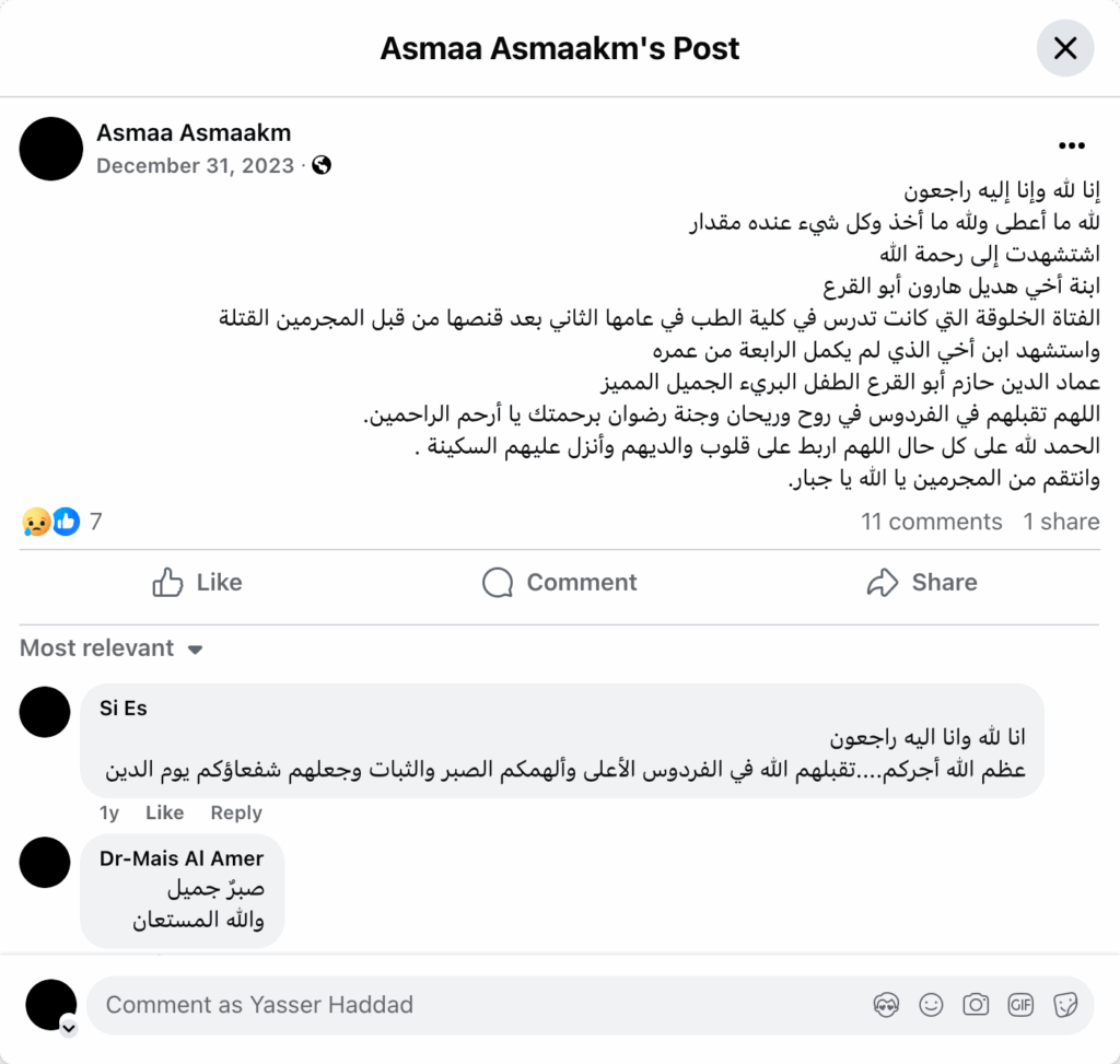To Allah we belong and to Him we shall return. To Allah belongs what He gives and to Allah belongs what He takes, and everything with Him is measured. My niece, Hadeel Haroun Abu Al-Qura’a, the virtuous girl who was in her second year of studying at the College of Medicine, was martyred to the mercy of Allah after being shot by criminal killers. My nephew, who was not even four years old, Imad Al-Din Hazem Abu Al-Qura’a, the innocent, beautiful, and distinguished child, was martyred. O Allah, accept them into Paradise in spirit and basil and in the Garden of Paradise, by Your mercy, O Most Merciful of the merciful. Praise be to Allah in every situation. O Allah, bind the hearts of their parents and send down tranquility upon them. And take revenge on the criminals, O Allah, O Almighty.
