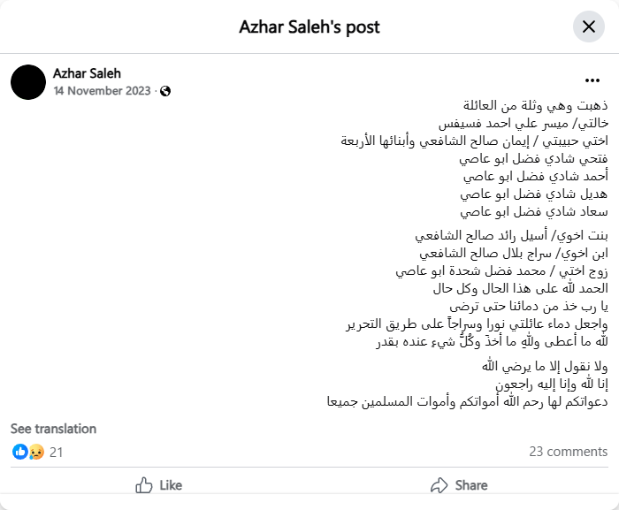 My aunt/ Maysar Ali Ahmed Fasifas My beloved sister/ Iman Saleh Al-Shafei and her four children: Fathi Shadi Fadl Abu Asi, Ahmed Shadi Fadl Abu Asi, Hadeel Shadi Fadl Abu Asi, Suad Shadi Fadl Abu Asi My brother’s daughter/ Aseel Raed Saleh Al-Shafei My brother’s son/ Siraj Bilal Saleh Al-Shafei My sister’s husband/ Muhammad Fadl Shahada Abu Asi