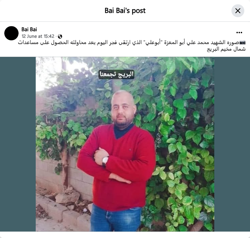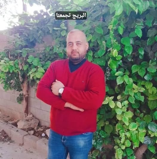 A photo of the martyr Muhammad Ali Abu al-Ma'za "Abu Ali" who was martyred this morning after trying to obtain aid north of al-Bureij camp.