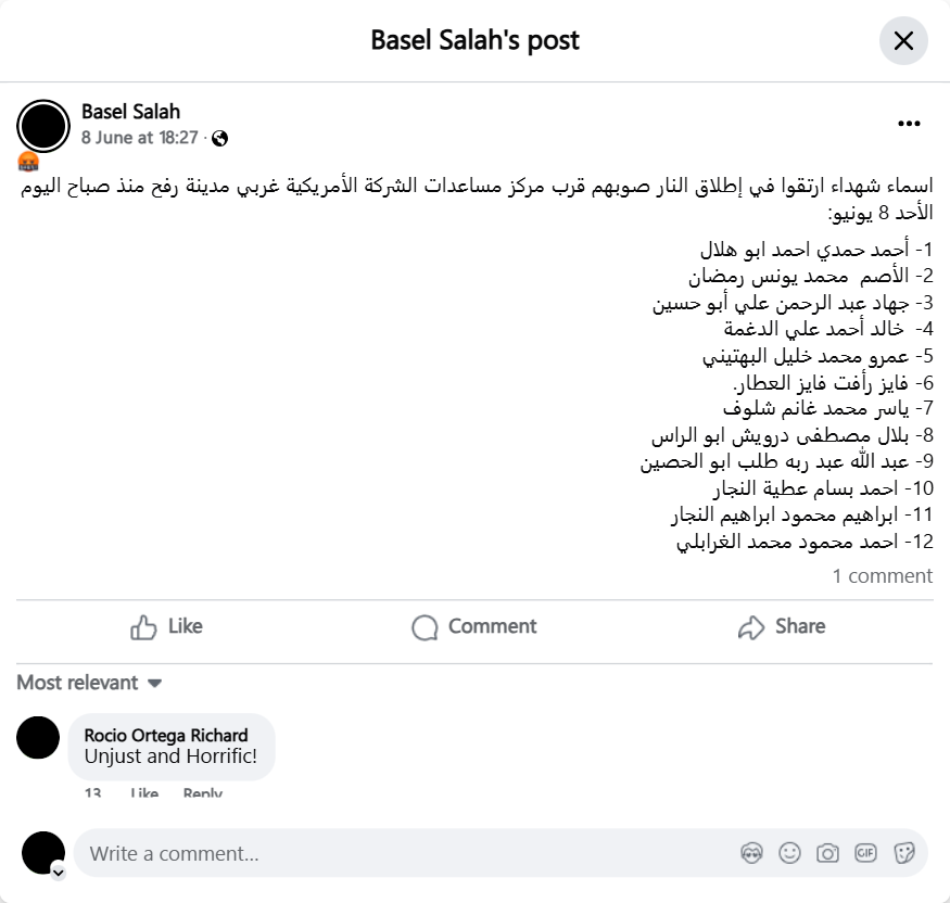 اسماء شهداء ارتقوا في إطلاق النار صوبهم قرب مركز مساعدات الشركة الأمريكية غربي مدينة رفح منذ صباح اليوم الأحد 8 يونيو:1- أحمد حمدي احمد ابو هلال 2- الأصم محمد يونس رمضان3- جهاد عبد الرحمن علي أبو حسين4- خالد أحمد علي الدغمة5- عمرو محمد خليل البهتيني 6- فايز رأفت فايز العطار.7- ياسر محمد غانم شلوف8- بلال مصطفى درويش ابو الراس 9- عبد الله عبد ربه طلب ابو الحصين 10- احمد بسام عطية النجار 11- ابراهيم محمود ابراهيم النجار 12- احمد محمود محمد الغرابلي