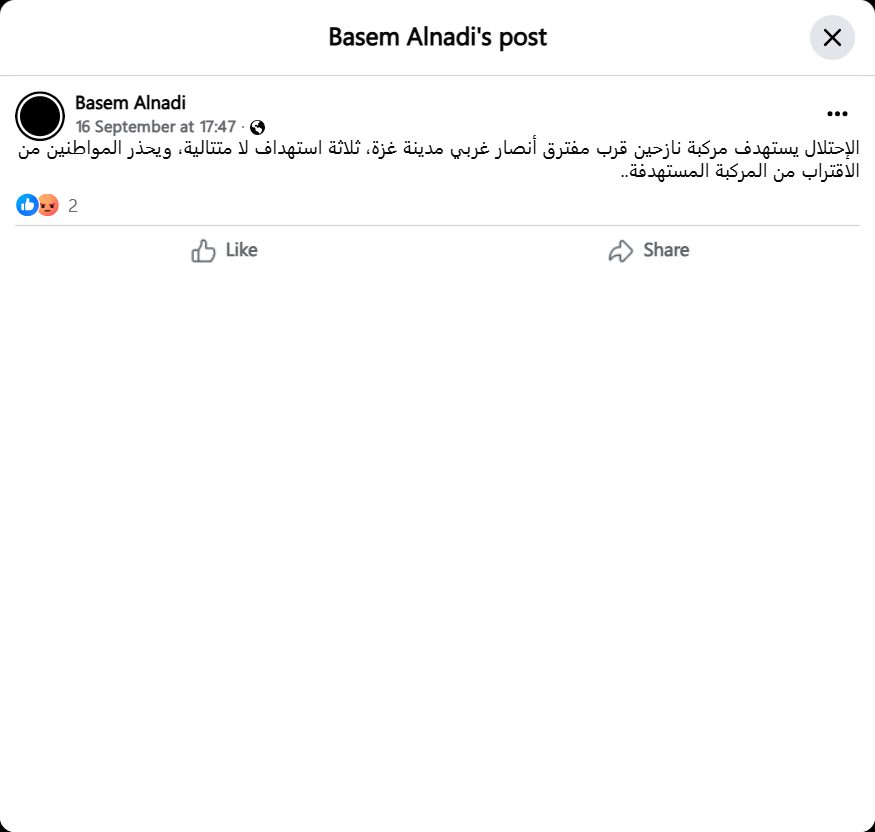 الإحتلال يستهدف مركبة نازحين قرب مفترق أنصار غربي مدينة غزة، ثلاثة استهداف لا متتالية، ويحذر المواطنين من الاقتراب من المركبة المستهدفة..