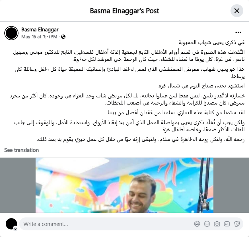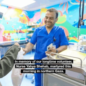 In loving memory of Yahya Shehab, this photo was taken in the Palestine Children's Relief Fund's Pediatric Oncology Department, under Dr. Musa and Suhail Nasser, in Gaza. It was once a space of healing, where compassion guided every step. This is Yahya Shehab, the hospital nurse whose quiet kindness and profound humanity touched the life of every child and family he cared for. Yahya was martyred this morning in northern Gaza. His loss is priceless, not only for those who worked alongside him, but for every young patient who found solace in his presence. He was more than just a nurse; he was a source of dignity, healing, and compassion in the most difficult moments. We are tired of writing these condolences. We are tired of losing the best among us. But we must honor Yahya's memory by continuing the work he believed in: saving lives, restoring hope, and standing by the most vulnerable, especially the children of Gaza. May God have mercy on him, may his pure soul rest in peace, and may his legacy live on through every charitable work he does thereafter.