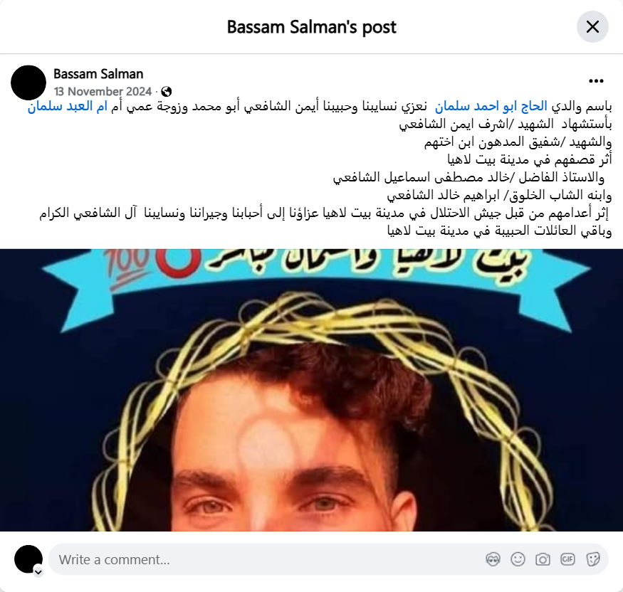 باسم والدي الحاج ابو احمد سلمان نعزي نسايبنا وحبيبنا أيمن الشافعي أبو محمد وزوجة عمي أم ام العبد سلمان بأستشهاد الشهيد /اشرف ايمن الشافعي والشهيد /شفيق المدهون ابن اختهم أثر قصفهم في مدينة بيت لاهيا والاستاذ الفاضل /خالد مصطفى اسماعيل الشافعي وابنه الشاب الخلوق/ ابراهيم خالد الشافعي إثر أعدامهم من قبل جيش الاحتلال في مدينة بيت لاهيا عزاؤنا إلى أحبابنا وجيراننا ونسايبنا آل الشافعي الكرام وباقي العائلات الحبيبة في مدينة بيت لاهيا
