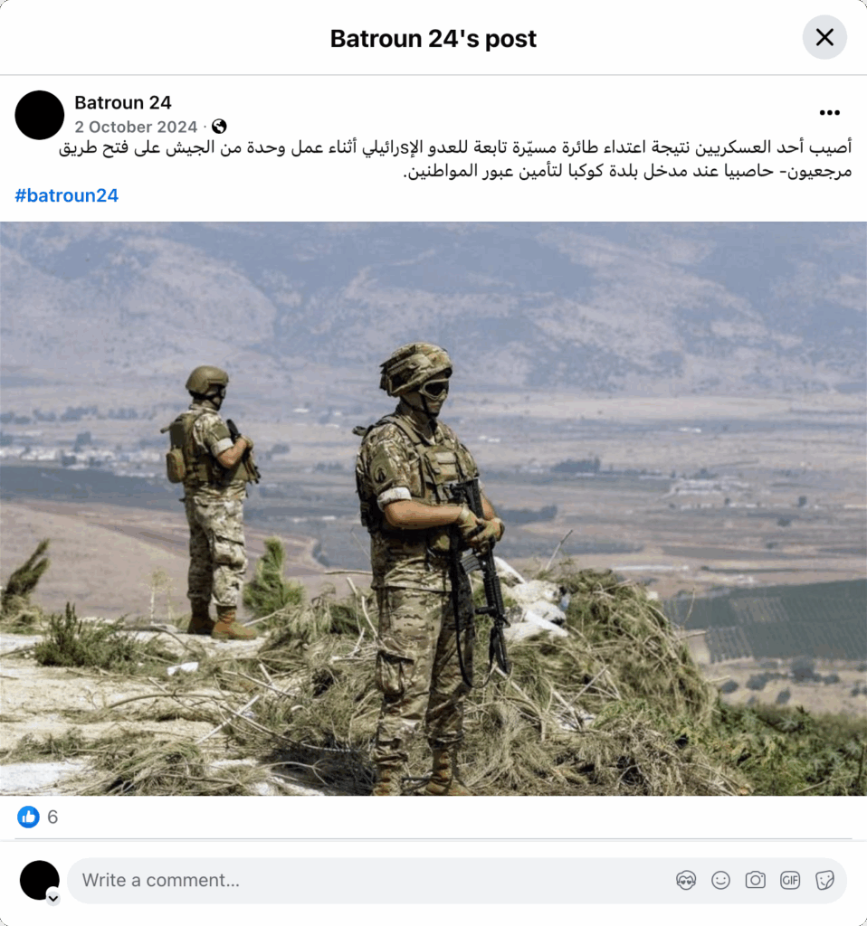 أصيب أحد العسكريين نتيجة اعتداء طائرة مسيّرة تابعة للعدو الإsرائيلي أثناء عمل وحدة من الجيش على فتح طريق مرجعيون- حاصبيا عند مدخل بلدة كوكبا لتأمين عبور المواطنين.#batroun24