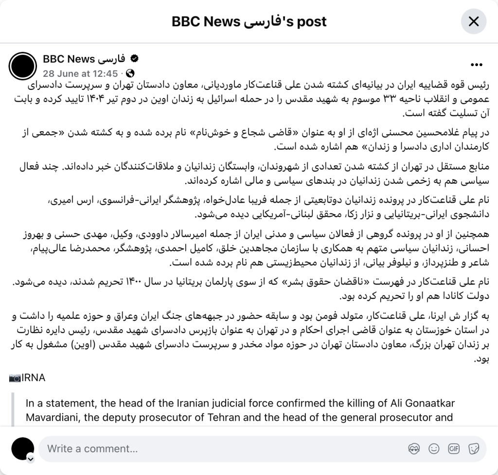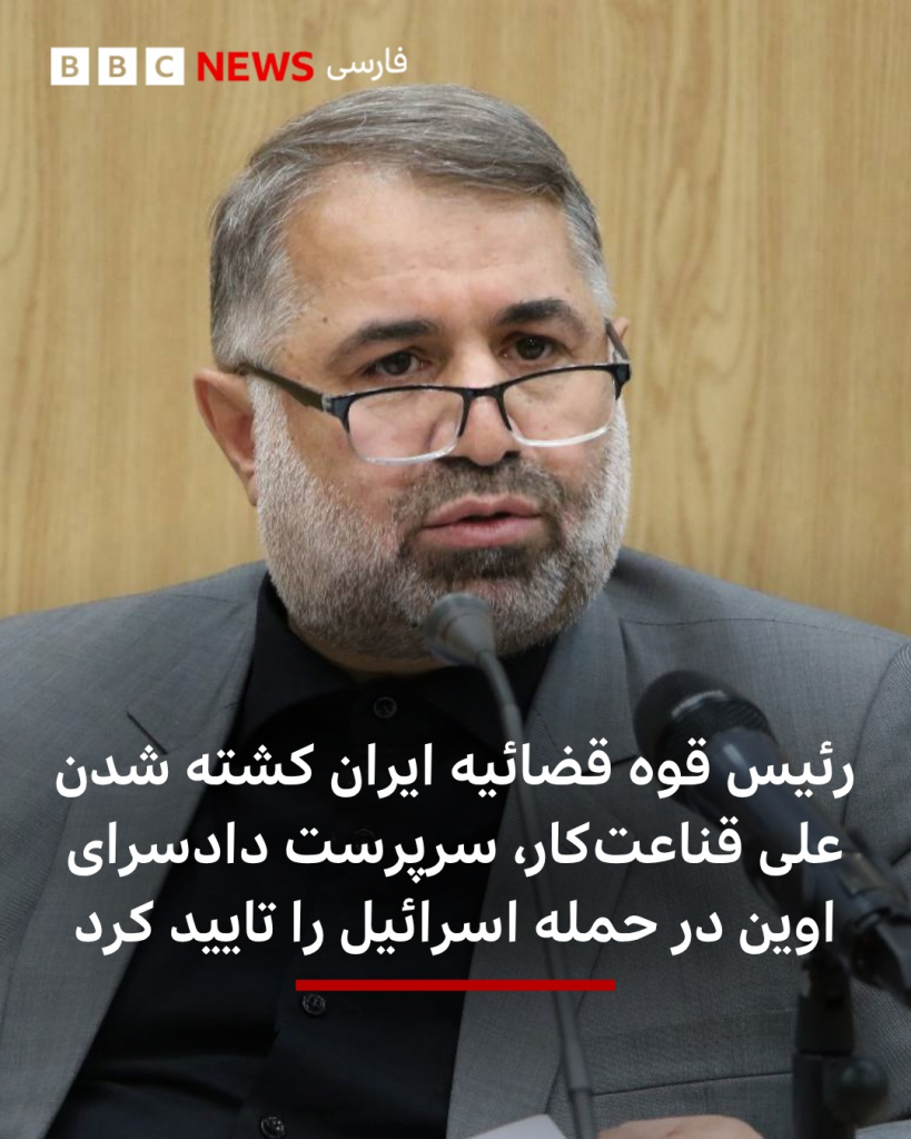 The head of the Iranian judiciary confirmed in a statement the killing of Ali Ghanetkar Mavardiani, deputy prosecutor of Tehran and head of the 33rd District Public and Revolutionary Prosecutor's Office, known as Martyr Moghaddas, in the Israeli attack on Evin Prison on June 2, 1404, and offered condolences. In a message from Gholamhossein Mohseni Ejei, he was named as a "brave and reputable judge" and the killing of "a number of administrative employees of the prosecutor's office and prison" was also mentioned. Independent sources in Tehran have reported the killing of a number of citizens, relatives of prisoners, and visitors. Several political activists have also mentioned the injuries suffered by prisoners in political and financial wards. Ali Ghanetkar's name appears in the case files of dual-nationality prisoners, including Fariba Adelkhah, an Iranian-French researcher, Aras Amiri, an Iranian-British student, and Nizar Zakka, a Lebanese-American researcher. He has also been mentioned in the case files of a group of Iranian political and civil activists, including Amirsalar Davoudi, a lawyer, Mehdi Hassani and Behrouz Ehsani, political prisoners accused of collaborating with the People's Mojahedin Organization, Kamil Ahmadi, a researcher, Mohammad Reza Alipayam, a poet and satirist, and Niloufar Bayani, an environmental prisoner. Ali Ghanetkar's name appears on the list of "human rights violators" who were sanctioned by the British Parliament in 1400. The Canadian government had also sanctioned him. According to IRNA, Ali Gonaatkar was born in Fouman and had a history of presence on the fronts of the Iran-Iraq war and the seminary. He worked in Khuzestan province as a judge for the execution of sentences and in Tehran as an investigator of the Shahid Moghaddas Prosecutor's Office, head of the supervision department of the Greater Tehran Prison, deputy prosecutor of Tehran in the field of narcotics, and head of the Shahid Moghaddas (Evin) Prosecutor's Office. IRNA In a statement, the head of the Iranian judicial force confirmed the killing of Ali Gonaatkar Mavardiani, the deputy prosecutor of Tehran and the head of the general prosecutor and revolution of district 33 known as the holy martyr in the Israeli attack on Evin prison on July 2, 1404, and expressed condolences for that. In the message of Gholam Hossein Mohseni Ajei, he was called a "brave and well-known judge" and mentioned the killing of "a number of administrative staff of the prosecutor and prison". Independent sources in Tehran have informed about the killing of a number of citizens, prisoners' affiliates and visitors. Several political activists have also mentioned the injuries of prisoners in political and financial bonds. The name of Ali Gonaatkar is seen in the case of two-time prisoners, including Fariba Adel Khah, Iranian-French researcher, Aras Amiri, Iranian-British student and Nazar Zaka, Lebanese-American researcher. He also mentioned environmental prisoners in the case of a group of Iranian political and civil activists, including Amirsalar Davoodi, lawyer, Mehdi Hasani and Behrouz Ehsani, political prisoners accused of cooperation with Mujahideen Khalq Organization, Kamil Ahmadi, researcher, Mohammad Reza Ali Payam, poet and comedian, and Niloufar Bayani. It has been. The name of Ali Ganayatkar is seen in the list of "Human rights violators" that were sanctioned by the British Parliament in 1400. The Canadian government had also sanctioned him. According to Irna, Ali Qanatkar, was born in Fomen and had a history of presence on the war fronts of Iran-Iraq and the academic field and in Khuzestan province as a judge in execution of sentences and in Tehran as interrogator of the Holy Martyr's Court, head of the Surveillance Circle of Greater Tehran Prison, deputy. Tehran's Prosecutor was working in the field of drugs and the head of the court of Martyr Muqd (Evin). IRNA · Hide Original · Rate this translation
