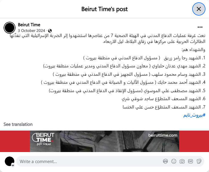 Archive URL: https://airwars.org/source/www-facebook-com-beirut-time-pfbid02tro9np8d2gqevp3eam2cw8spq8mk5q8kksyh7upcjfhge9quhzmrmm252oo6tqu8l-2024-10-03-090000/