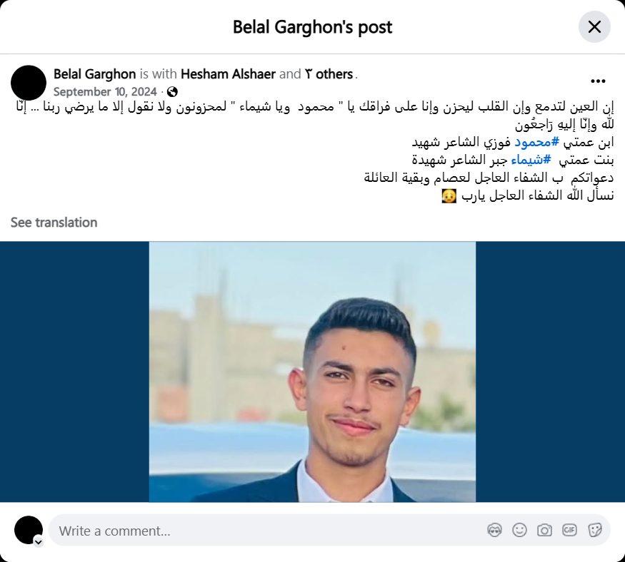 The eyes shed tears and the heart is saddened, and we are truly saddened by your departure, Mahmoud and Shaimaa. We only say what pleases our Lord... To God we belong and to Him we shall return. My cousin #Mahmoud Fawzy, the poet, is a martyr. My cousin #Shaimaa Gabr, the poet, is a martyr. Please pray for a speedy recovery for Essam and the rest of the family. We ask God for a speedy recovery, Lord.