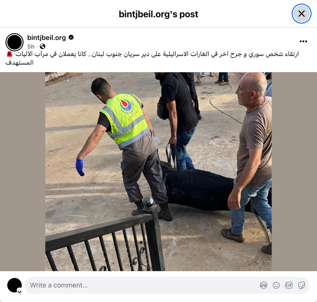ارتقاء شخص سوري و جرح آخر في الغارات الاسرائيلية على دير سريان جنوب لبنان.. كانا يعملان في مرآب الآليات المستهدف