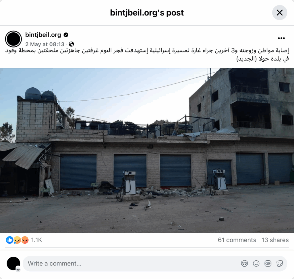 إصابة مواطن وزوجته و3 آخرين جراء غارة لمسيرة إسرائيلية إستهدفت فجر اليوم غرفتين جاهزتين ملحقتين بمحطة وقود في بلدة حولا (الجديد)