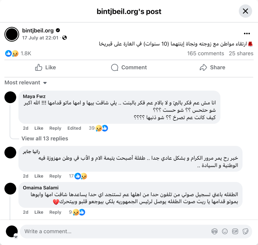 ارتقاء مواطن مع زوجته ونجاة إبنتهما (10 سنوات) في الغارة على قبريخا
