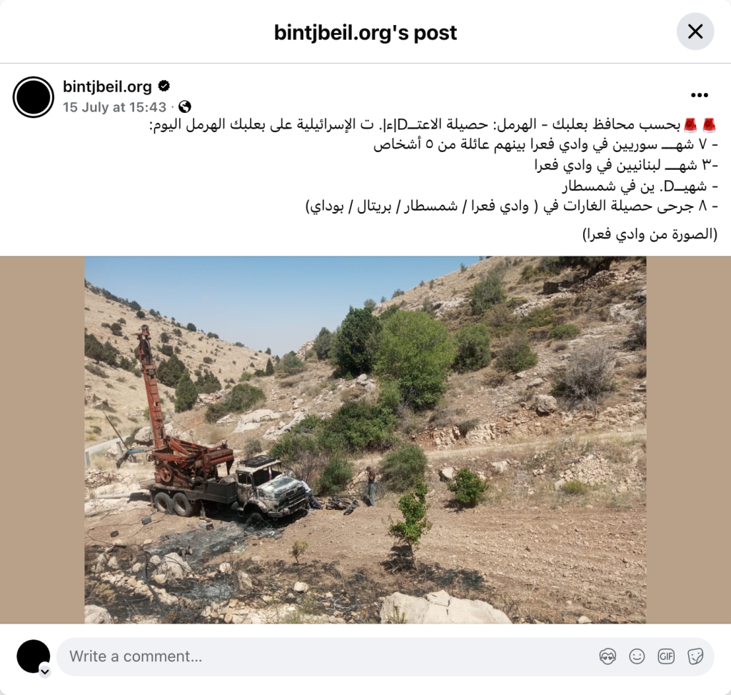 Archive URL: https://airwars.org/source/www-facebook-com-bintjbeil-org-pfbid02taj6f7lbrkdyi8vqb8hb7xgofhdabkksghvt94uhazntyztxtedjcgcilto1jkaml-2025-07-15-124300-3/