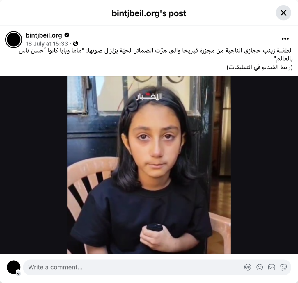Little Zainab Hijazi, a survivor of the Qabrikha massacre, shook the consciences with her earthquake-like voice: "Mama and Papa were the best people in the world" (video link in the comments)