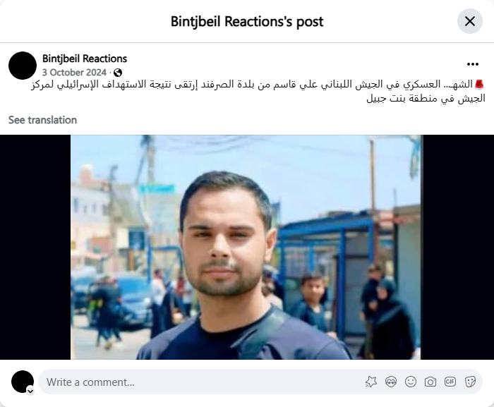 The martyr... soldier in the Lebanese army, Ali Qassem, from the town of Sarafand, was martyred as a result of the Israeli targeting of the army center in the Bint Jbeil area.