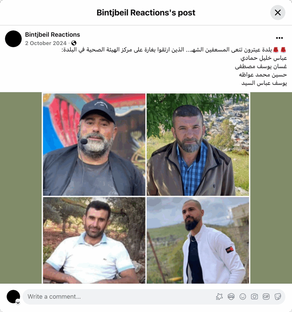 بلدة عيترون تنعى المسعفين الشهـ... الذين ارتقوا بغارة على مركز الهيئة الصحية في البلدة: عباس خليل حمادي غسان يوسف مصطفى حسين محمد عواظه يوسف عباس السيد