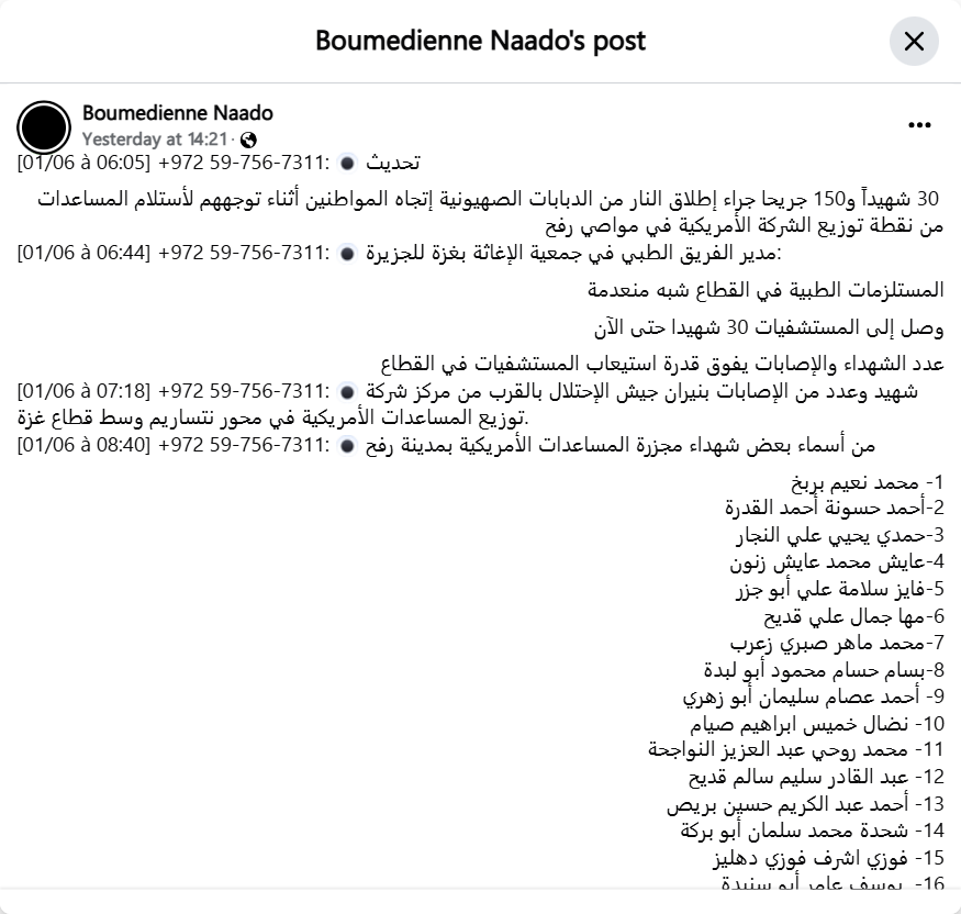 [01/06 at 06:05] +972 59-756-7311: Update: 30 martyrs and 150 wounded as a result of Israeli tank fire on citizens while they were heading to receive aid from the American company’s distribution point in Rafah. [01/06 at 06:44] +972 59-756-7311: Director of the medical team at the Relief Society in Gaza to Al Jazeera: Medical supplies in the Strip are almost non-existent. 30 martyrs have arrived at hospitals so far. The number of martyrs and injuries exceeds the capacity of hospitals in the Strip. [01/06 at 07:18] +972 59-756-7311: A martyr and a number of injuries as a result of Israeli army fire near the American aid distribution company’s center in the Netzarim axis in the central Gaza Strip. [01/06 at 08:40] +972 59-756-7311: From Names of some of the martyrs of the American aid massacre in Rafah City 1- Muhammad Naim Barbakh 2- Ahmad Hassouna Ahmad Al-Qudra 3- Hamdi Yahya Ali Al-Najjar 4- Ayesh Muhammad Ayesh Zenun 5- Fayez Salama Ali Abu Jazzar 6- Maha Jamal Ali Qudaih 7- Muhammad Maher Sabry Za’rab 8- Bassam Hussam Mahmoud Abu Labda 9- Ahmad Essam Suleiman Abu Zuhri 10- Nidal Khamis Ibrahim Siam 11- Muhammad Rawhi Abdul Aziz Al-Nawajha 12- Abdul Qader Salim Salem Qudaih 13- Ahmad Abdul Karim Hussein Bris 14- Shahada Muhammad Salman Abu Baraka 15- Fawzi Ashraf Fawzi Dahliz 16- Yusef Amer Abu Sunayda 17- Atef Shahada Salem Siam 18- Iyad Tahseen Adel Al-Muqnan 19- Asmaa Ayman Musa Abu Ta’ima 20- Fouad Salim Subhi Abu Al-Khair 21- Jihad Raef Salam Shurab (rescue of Al-Manara neighborhood). 22- Wissam Subhi Abu Accuracy (Care) [01/06 à 09:09] +972 59-756-7311: Identifying one of the martyrs of the bombing of the pocket in the center of Khan Yunis, the martyr/ Ahmed Abdullah Abu Mustafa.