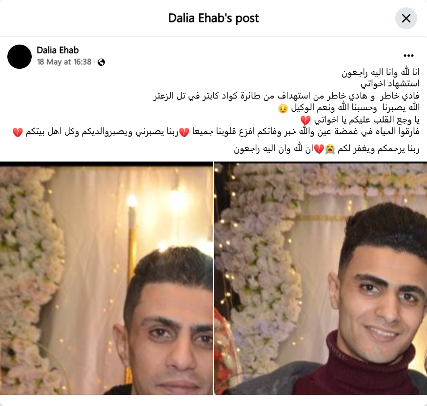 We belong to Allah and to Him we shall return. My sisters Fadi Khater and Hadi Khater were martyred by a quadcopter attack in Tel al-Zaatar. May Allah give us patience. Allah is sufficient for us, and He is the best Disposer of affairs. My heart aches for you, my sisters. They left this life in the blink of an eye. The news of your death terrified all of our hearts. May Allah give me, your parents, and all your family patience. May Allah have mercy on you and forgive you. To Allah we belong and to Him we shall return.