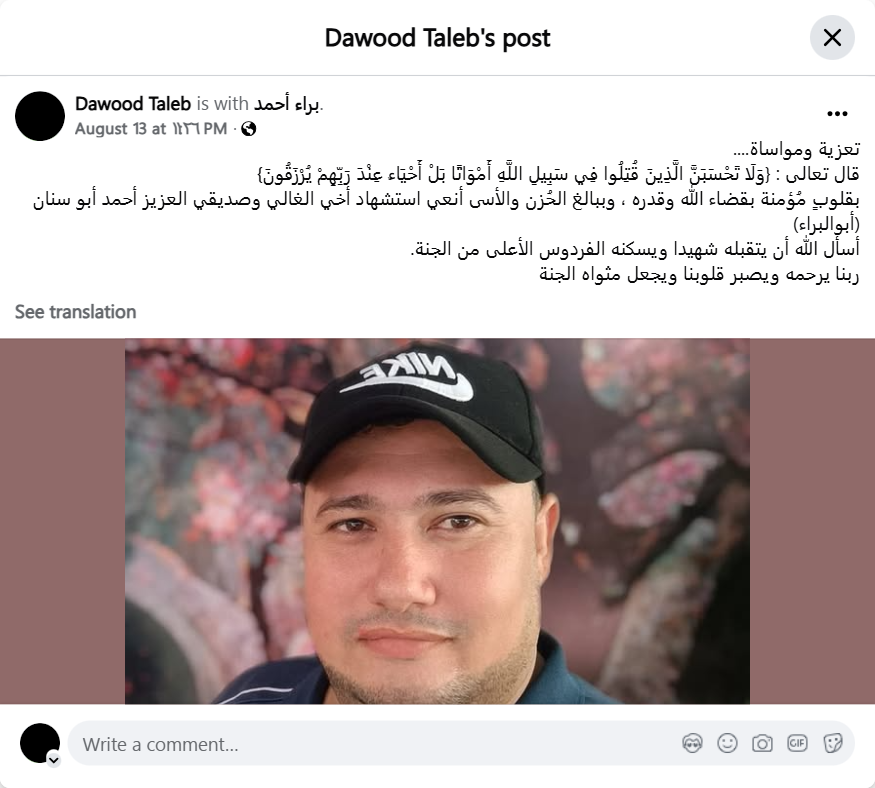 With hearts that believe in God’s will and destiny, and with great sadness and sorrow, I mourn the martyrdom of my dear brother and dear friend, Ahmed Abu Sinan (Abu Al-Baraa).