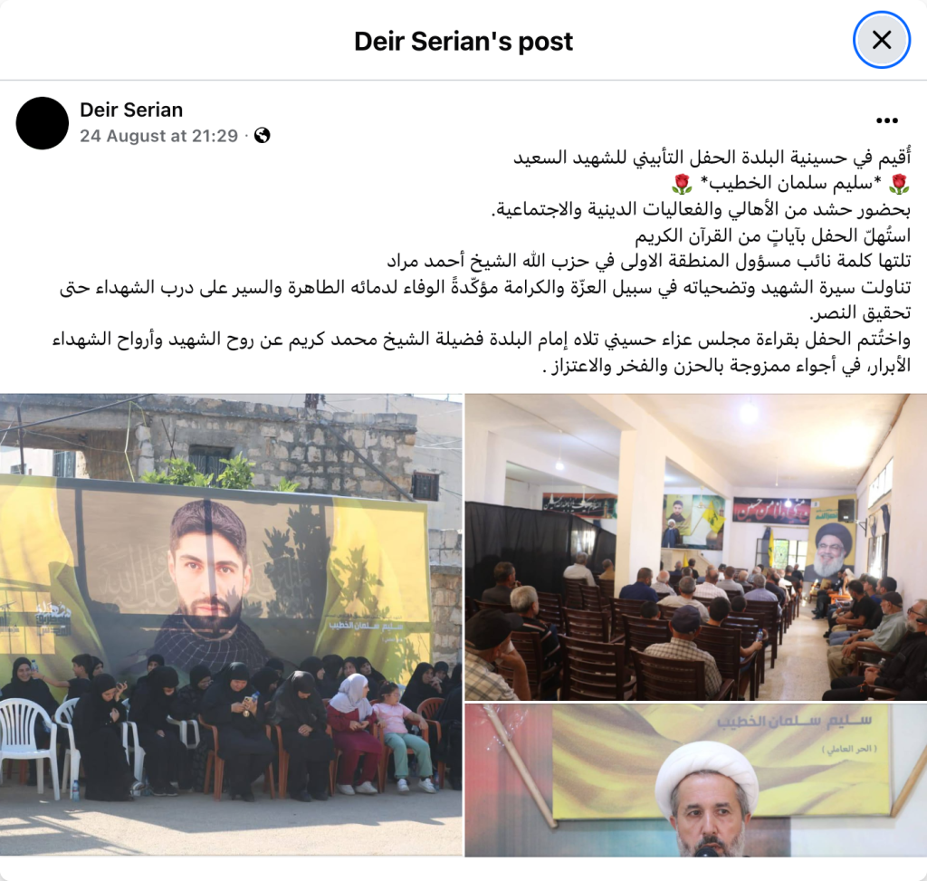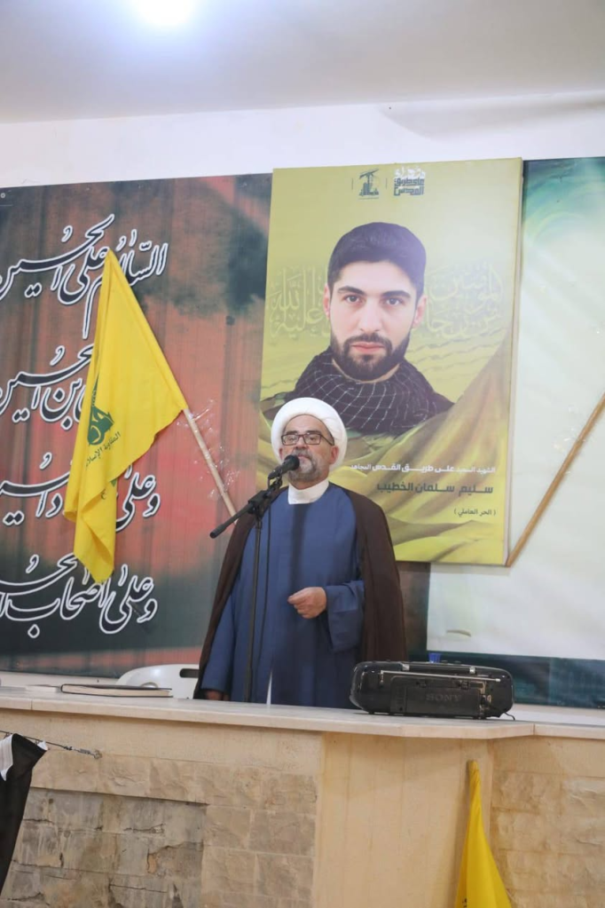 A memorial service was held in the town's Husseiniya for the martyr Salim Salman al-Khatib, attended by a crowd of residents and religious and social figures. The ceremony began with verses from the Holy Quran, followed by a speech by the Deputy Head of Hezbollah's First Region, Sheikh Ahmad Murad. The speech addressed the martyr's life and sacrifices for the sake of honor and dignity, affirming loyalty to his pure blood and following in the path of the martyrs until victory is achieved. The ceremony concluded with a recitation of a Husseini condolence verse, recited by the town's imam, Sheikh Muhammad Karim, in memory of the martyr and the souls of the righteous martyrs, in an atmosphere filled with sadness, pride, and honor.