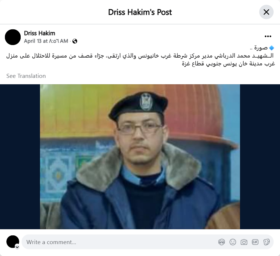 الــشهيــد محمد الدرباشي مدير مركز شرطة غرب خانيونس والذي ارتقى، جرّاء قصف من مسيرة للاحتلال على منزل غرب مدينة خان يونس جنوبي قطاع غزة