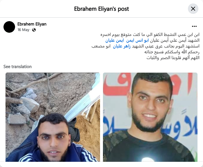 My active and competent cousin, the one I never expected to lose, the martyr Ayman Ali Ayman Alian, Abu Anas Ayman Ayman Alian, was martyred today, next to the vein of my eye, the martyr Zaher Alian, Abu Musab. May God have mercy on you and grant you a place in His spacious gardens. May God inspire our hearts with patience and steadfastness.