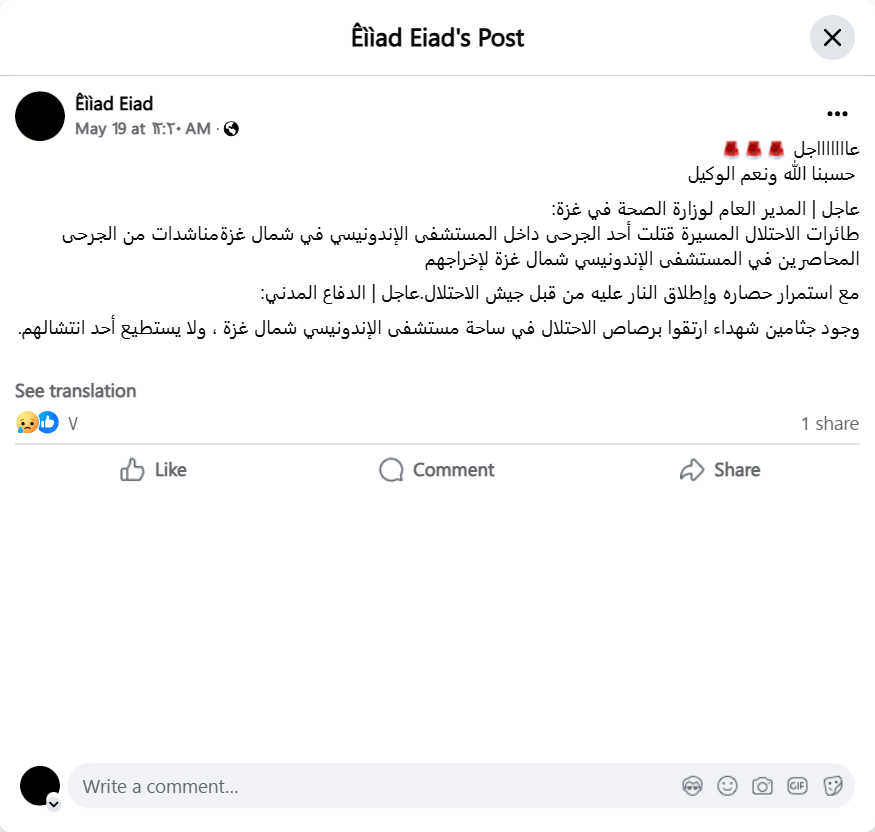 وجود جثامين شهداء ارتقوا برصاص الاحتلال في ساحة مستشفى الإندونيسي شمال غزة ، ولا يستطيع أحد انتشالهم.