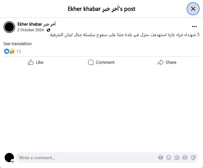 5 شهـداء جراء غارة استهدفت منزل في بلدة جنتا على سفوح سلسلة جبال لبنان الشرقية.