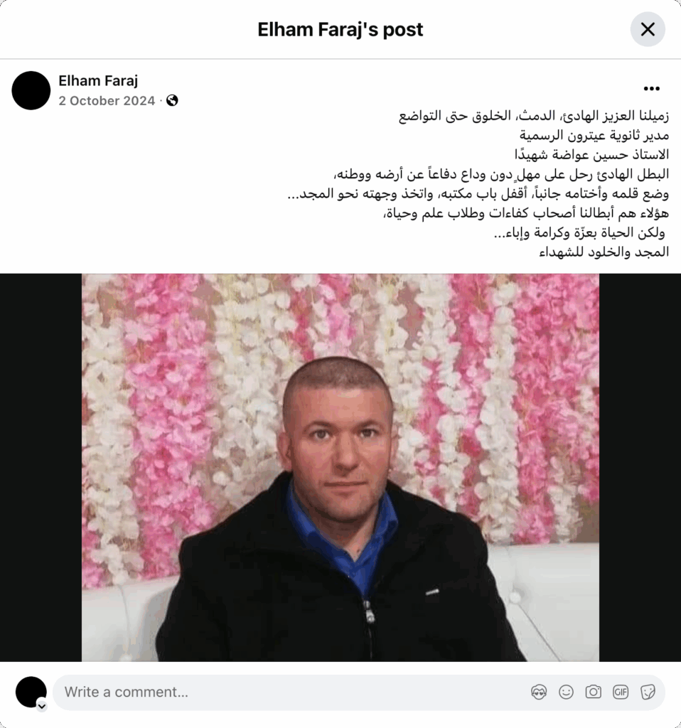 زميلنا العزيز الهادئ، الدمث، الخلوق حتى التواضعمدير ثانوية عيترون الرسميةالاستاذ حسين عواضة شهيدًاالبطل الهادئ رحل على مهلٍ دون وداع دفاعاً عن أرضه ووطنه،وضع قلمه وأختامه جانباً، أقفل باب مكتبه، واتخذ وجهته نحو المجد... هؤلاء هم أبطالنا أصحاب كفاءات وطلاب علم وحياة، ولكن الحياة بعزّة وكرامة وإباء... المجد والخلود للشهداء