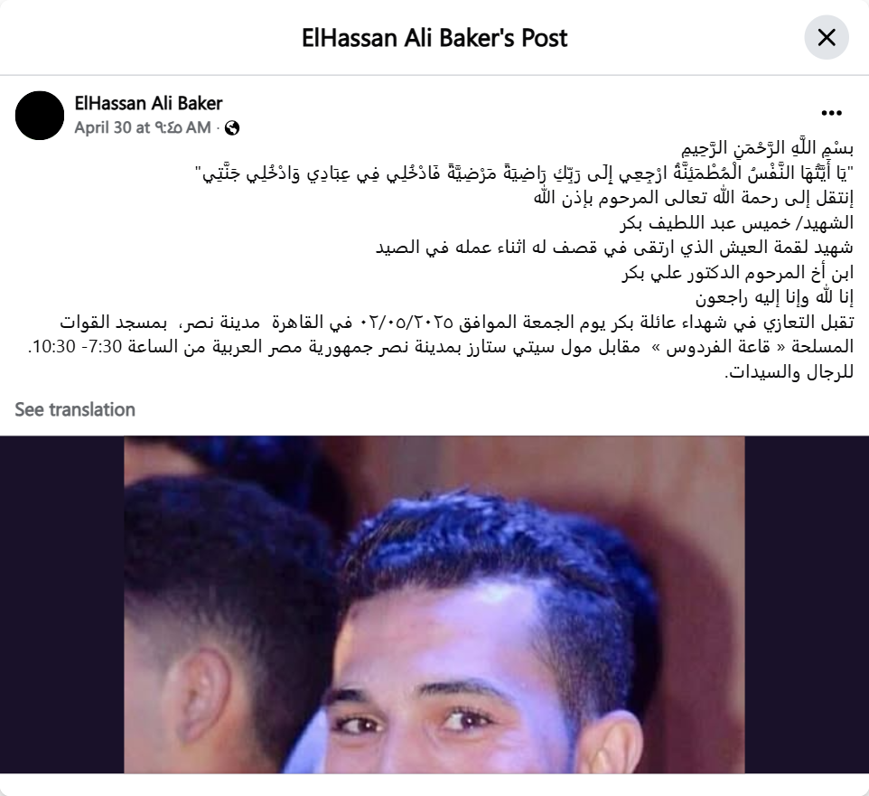 In the name of Allah, the Most Gracious, the Most Merciful "O reassured soul, return to your Lord, well-pleased and pleasing [to Him], and enter among My servants and enter My Paradise." The late martyr Khamis Abdul Latif Bakr, a livelihood martyr who was killed in a bombing while working as a fisherman, the nephew of the late Dr. Ali Bakr, has passed away to the mercy of God Almighty. To God we belong and to Him we shall return. Condolences will be accepted for the martyrs of the Bakr family on Friday 02/05/2025 in Cairo, Nasr City, at the Armed Forces Mosque "Al-Firdaws Hall" opposite City Stars Mall in Nasr City, Arab Republic of Egypt, from 7:30-10:30. For men and women.