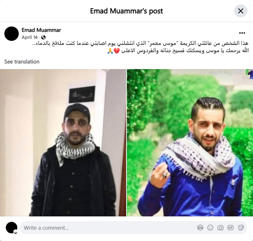 This person from my honorable family, "Musa Muammar," who rescued me the day I was injured, when I was covered in blood... May God have mercy on you, Musa, and grant you a place in His spacious gardens and the highest paradise.