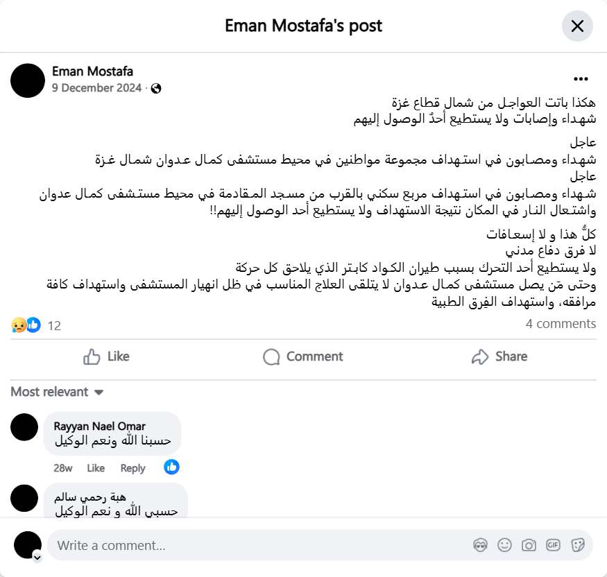Archive URL: https://airwars.org/source/www-facebook-com-eman-mostafa-pfbid02evjsvxhot8no6dmv7uvyum3vjkqnb1a8bndnlxwwwerlmpuwxqiquea8j3uyxrhgl-2024-12-09-110000/