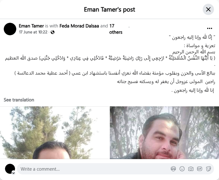 With deep sorrow and sadness, and with hearts that believe in God’s will, we offer our condolences for the martyrdom of my cousin (Ahmed Attia Mohammed Al-Daalsah).