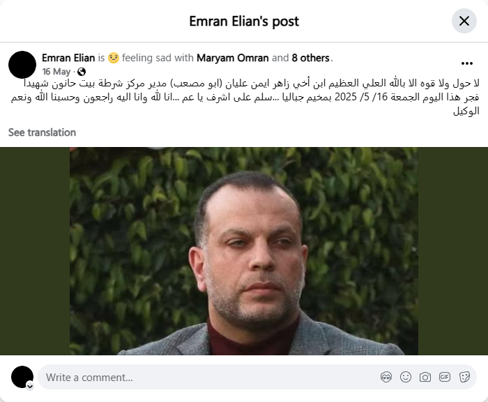 There is no power nor strength save in God, the Most High, the Almighty. My nephew, Zaher Ayman Alian (Abu Musab), the director of the Beit Hanoun police station, was martyred at dawn today, Friday, May 16, 2025, in the Jabalia camp... Greetings to Ashraf, uncle... We belong to God and to Him we shall return, and God is sufficient for us, and He is the best Disposer of affairs.