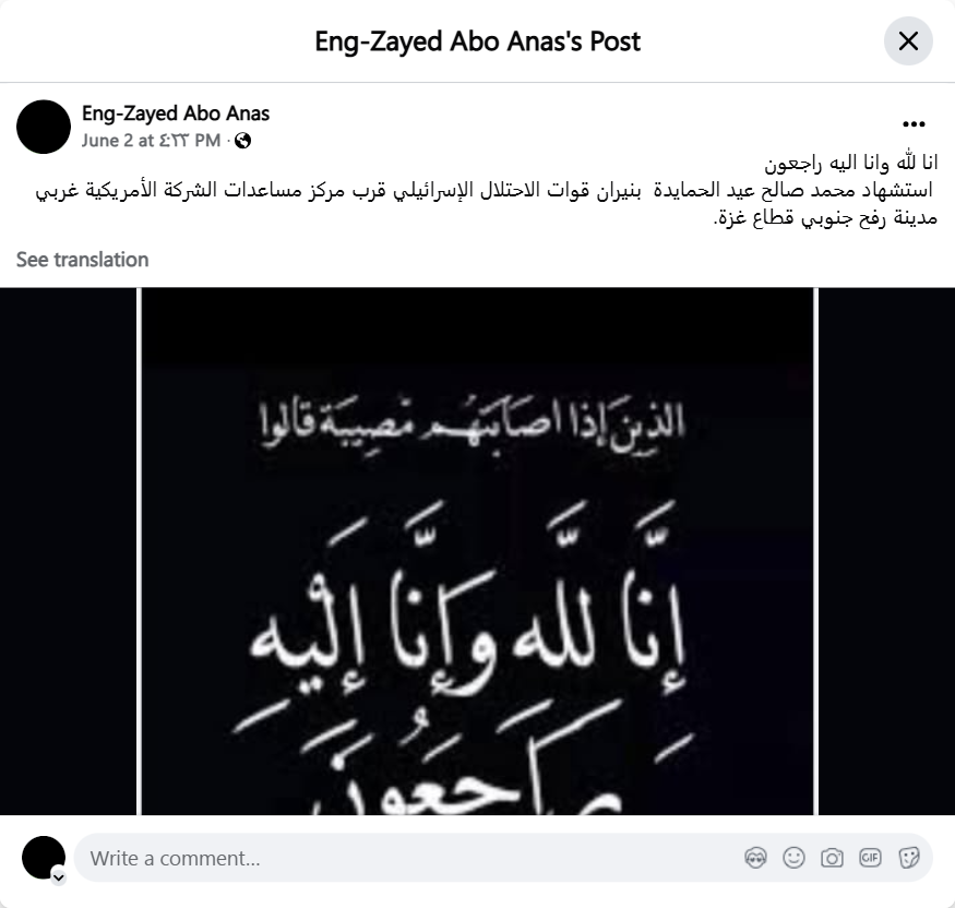 استشهاد محمد صالح عيد الحمايدة بنيران قوات الاحتلال الإسرائيلي قرب مركز مساعدات الشركة الأمريكية غربي مدينة رفح جنوبي قطاع غزة.