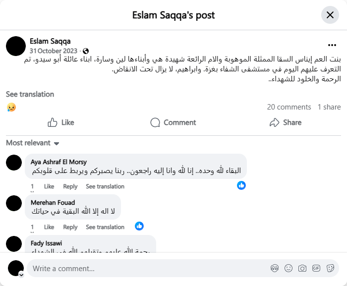 My cousin Enas Al-Saqa, the talented actress and wonderful mother, is a martyr, along with her children, Lina and Sarah, members of the Abu Sido family. They were identified today at Al-Shifa Hospital in Gaza. Ibrahim is still under the rubble. May the martyrs rest in peace.