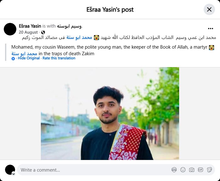 Muhammad, my cousin, the handsome, polite young man who memorized the Book of God, the martyr Muhammad Abu Sitta in the traps of death, Zakim
